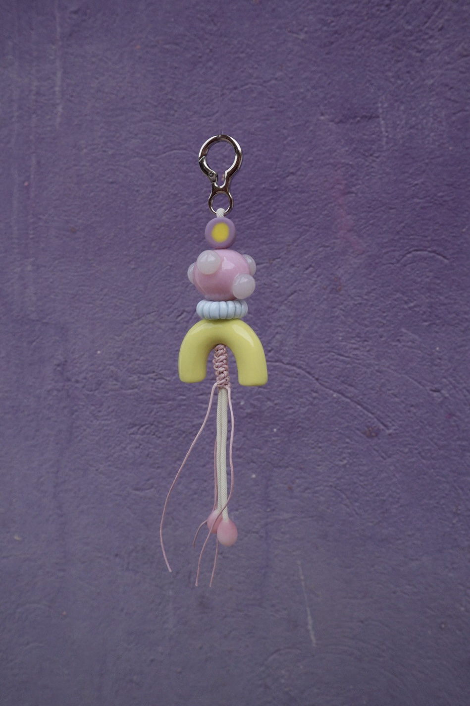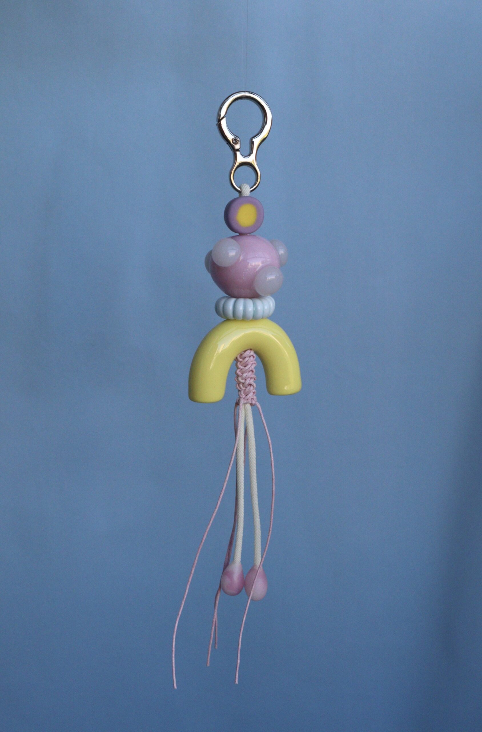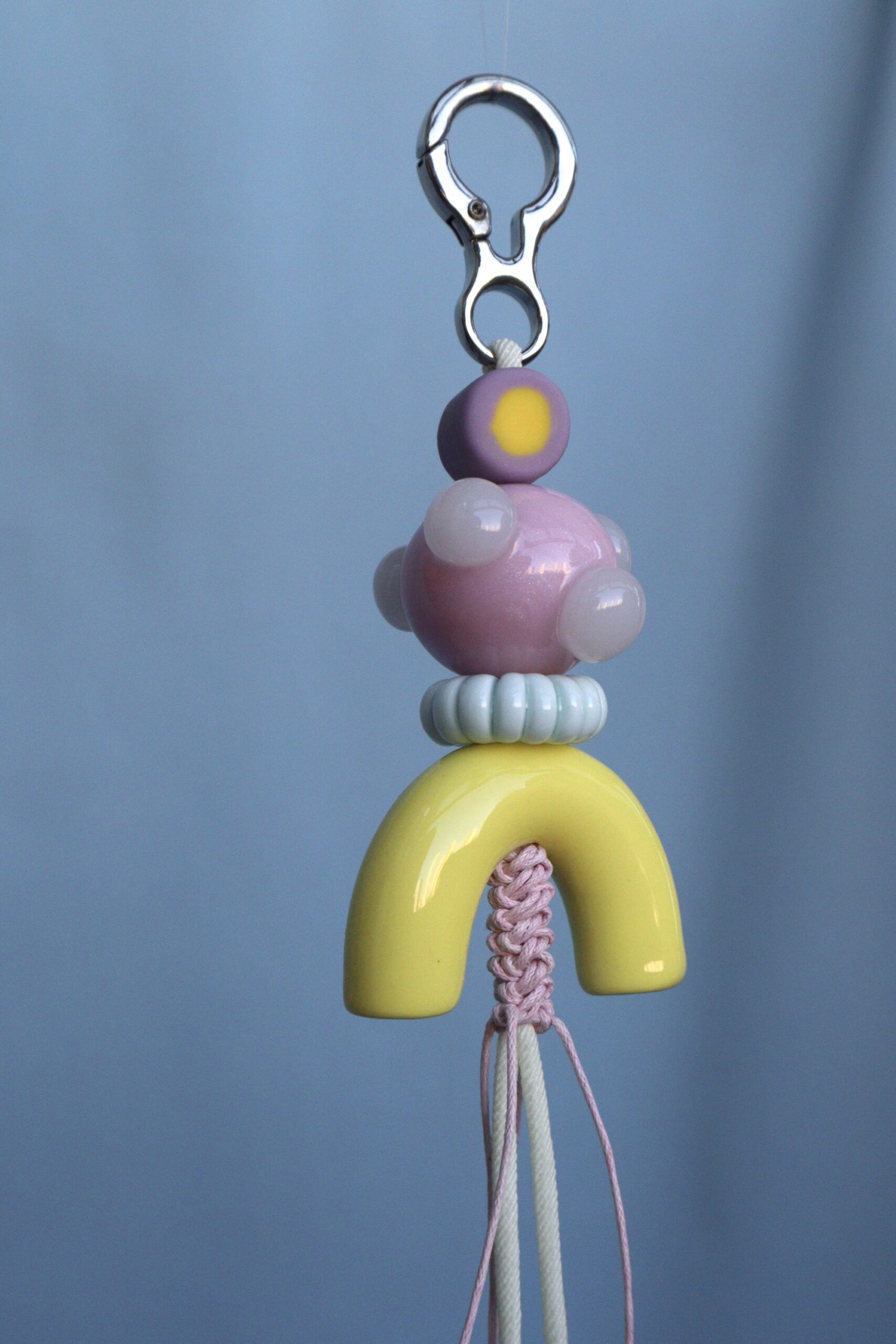 Брелок/подвес на сумку и тп. Полимерная глина, шнуры, стеклянные бусины, цветочек из акрила. Длина 16 см., диаметр карабина 2 см.